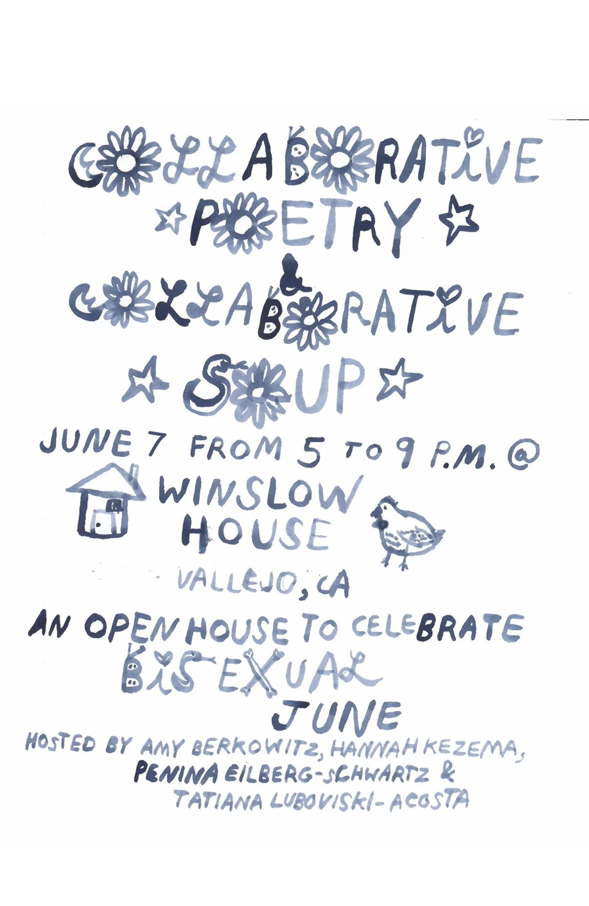 if you wish to participate in collaborative soup-making, please bring a vegetable, can of beans, or grain before 6 PM! broth, alliums, herbs, spices, celery, & carrot will already be provided.