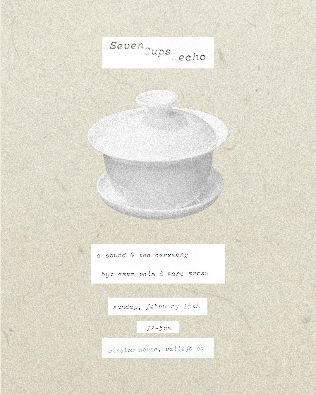 7 Cups Echo is a quadrophonic participatory performance that explores sound and movement in the context of an intimate tea ceremony. As participants are invited to drink tea using an augmented tea set, their gestures contribute to an evolving landscape of environmental sounds inspired by Vallejo.